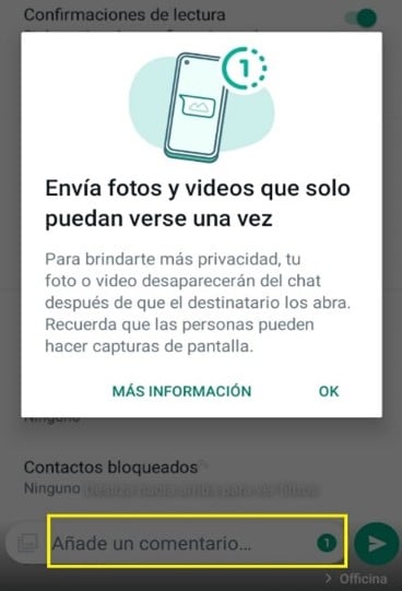 Con esta opción, al enviar mensajes de fotos o videos se tiene la posibilidad de que la persona que los reciba los vea una sola vez, con esto se asegura que estos mensajes solo sean leídos, pero no almacenados en el dispositivo, otorgando mayor privacidad de datos para el usuario. Esto se activa al momento de enviar el mensaje, a través del icono verde de la caja de mensajes, así como se muestra en la imagen.
