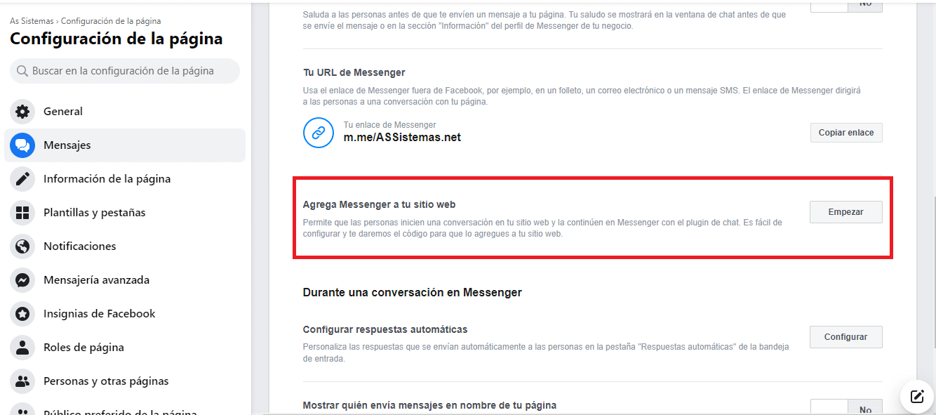 - Ve a la configuración de la página > Mensajes > En la parte de Agrega Messenger a tu sitio web le damos clic en empezar.